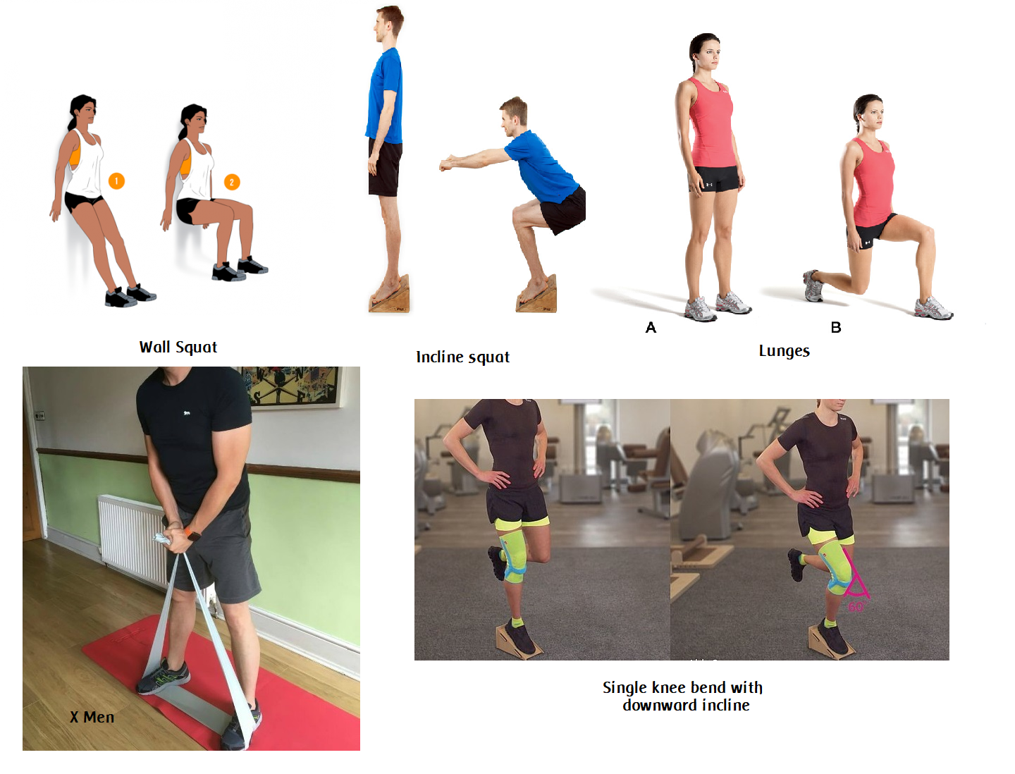 Squats - Legs shoulder width apart, push hips back, bend knees until thighs are parallel to the floor keeping knees behind toes, stand up tightening thigh muscles. Start with 20 repetitions and increase sets with a minute’s rest in between. To progress use weights.